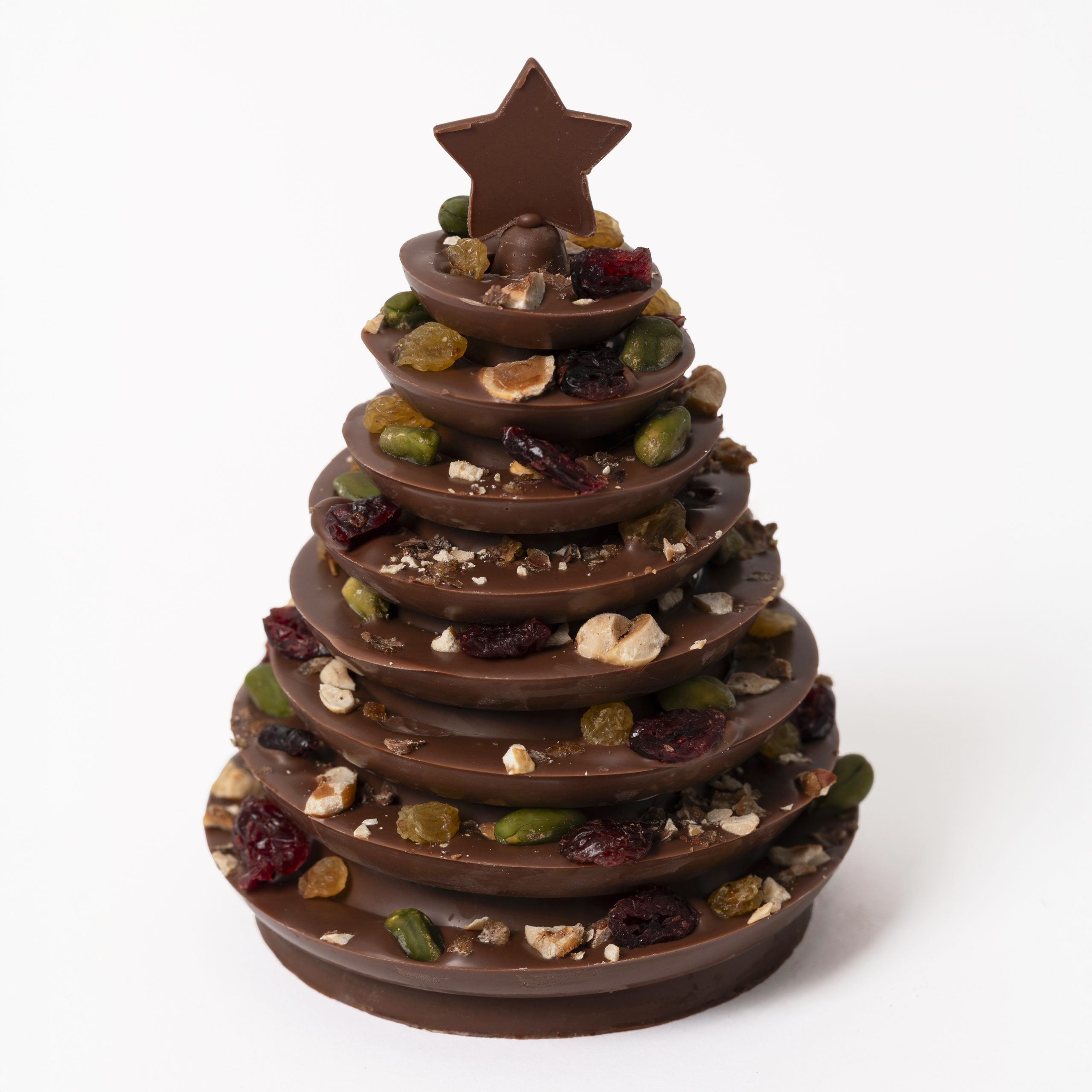 Succombez à l’intensité de notre sapin mendiant en chocolat au lait 41%, garni de fruits secs et confits sélectionnés avec soin.